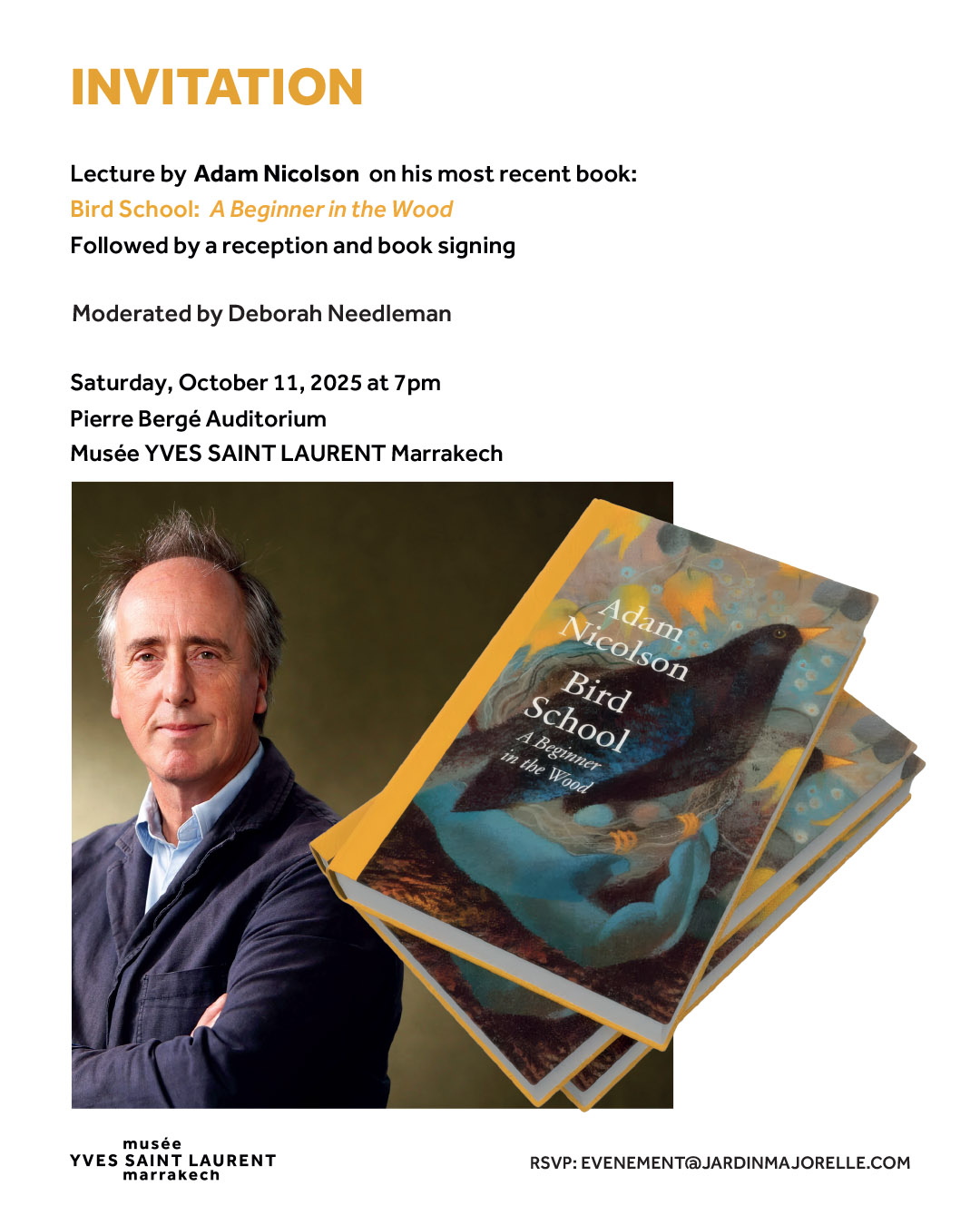 The Musée Yves Saint Laurent Marrakech welcomes the award-winning journalist and author Adam Nicolson for a conference followed by a book signing. At the conference, moderated by Deborah Needleman, Nicolson will share with us, through naturalist observations and inspiring stories, his poetic and engaged look at birds and their relationship to our environment. Hailed by the British press as « a celebration of hearts and minds, » Nicolson’s work encourages us to reconnect with the wonder and grace of animal life.